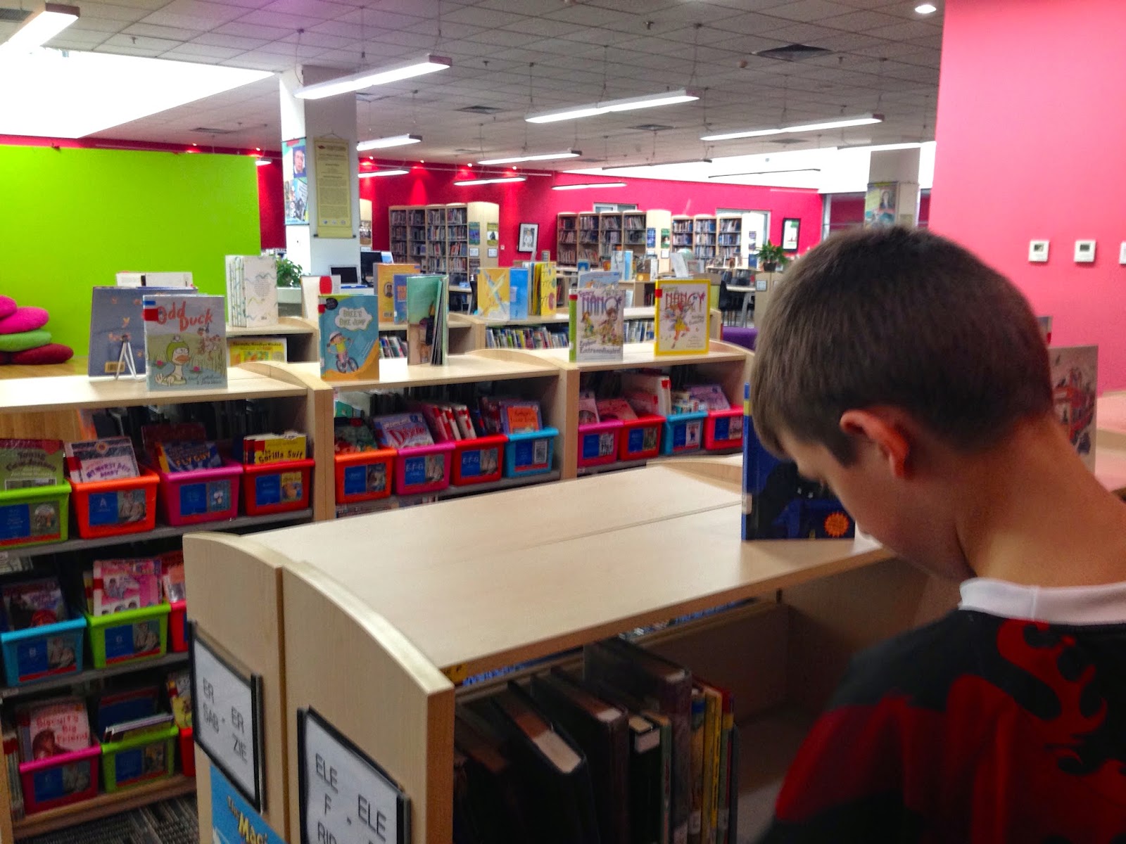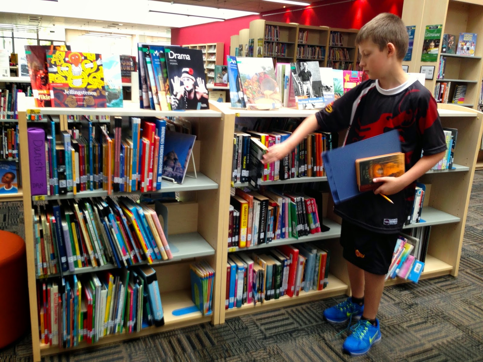 Her er nogle billeder fra skolens bibliotek. Valdemar er i PE uniform (det tøj de skal have på til idræt).