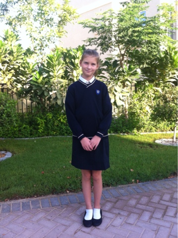 Leonora var også klar til at komme i skole, og jeg måtte oven i købet tage billeder af hende i uniform.