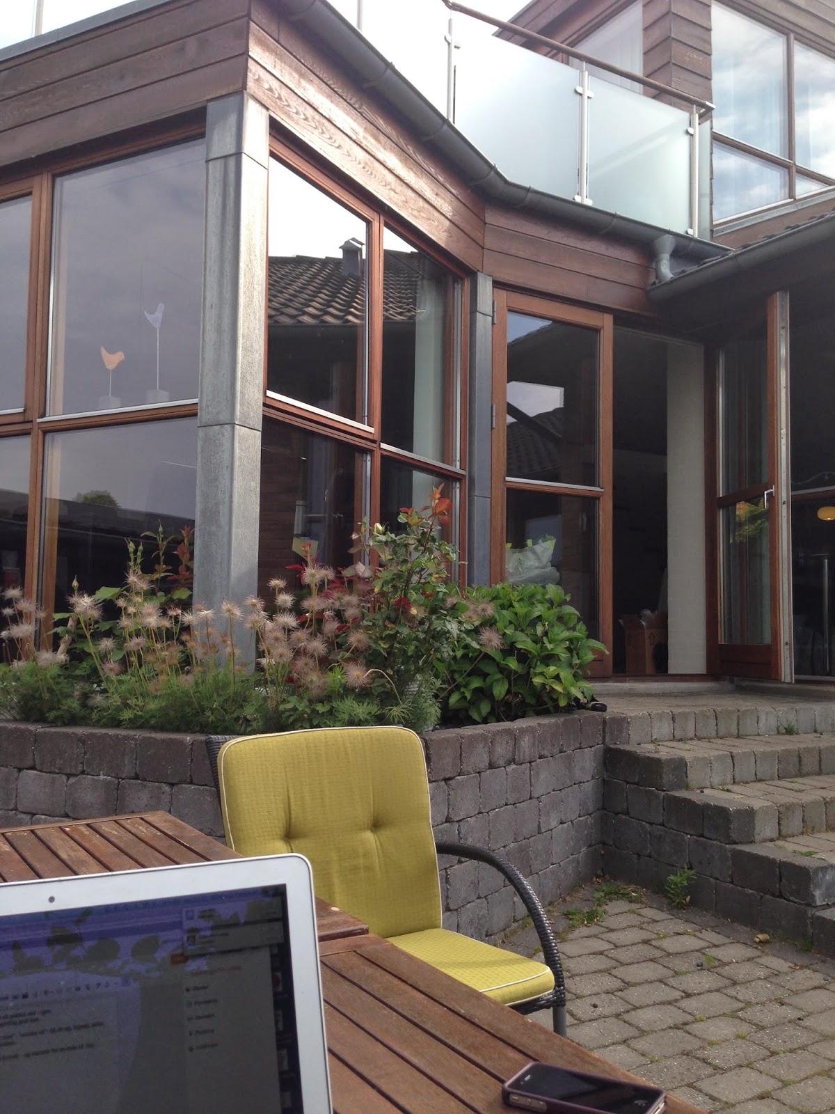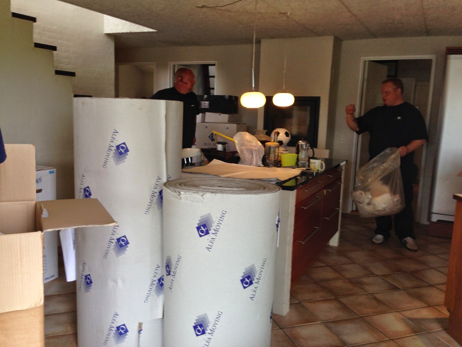 Klokken 8:00 kom flyttemændende så – fem mænd og en kvinde – og startede fra en ende af. Jeg sidder nu her, på terrassen med min telefon og computer – for indenfor kan jeg kun komme til at gå i vejen 🙂