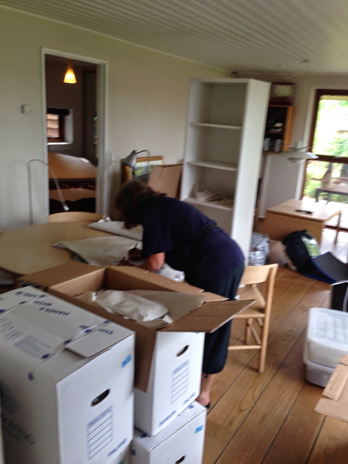 Vi har, de sidste to dage, sorteret i “skal med”, “skal ikke med”, “smides ud”. Så alt tøj, legetøj, skåle, glas, tallerkener er nu klar til at komme i kasser, – og container.
