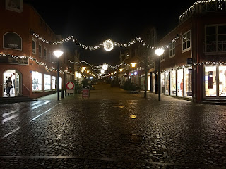| Ingen julepynt i Kina, så vi nød udsmykningen i alle de byer vi kom til. Her er det Struer. |