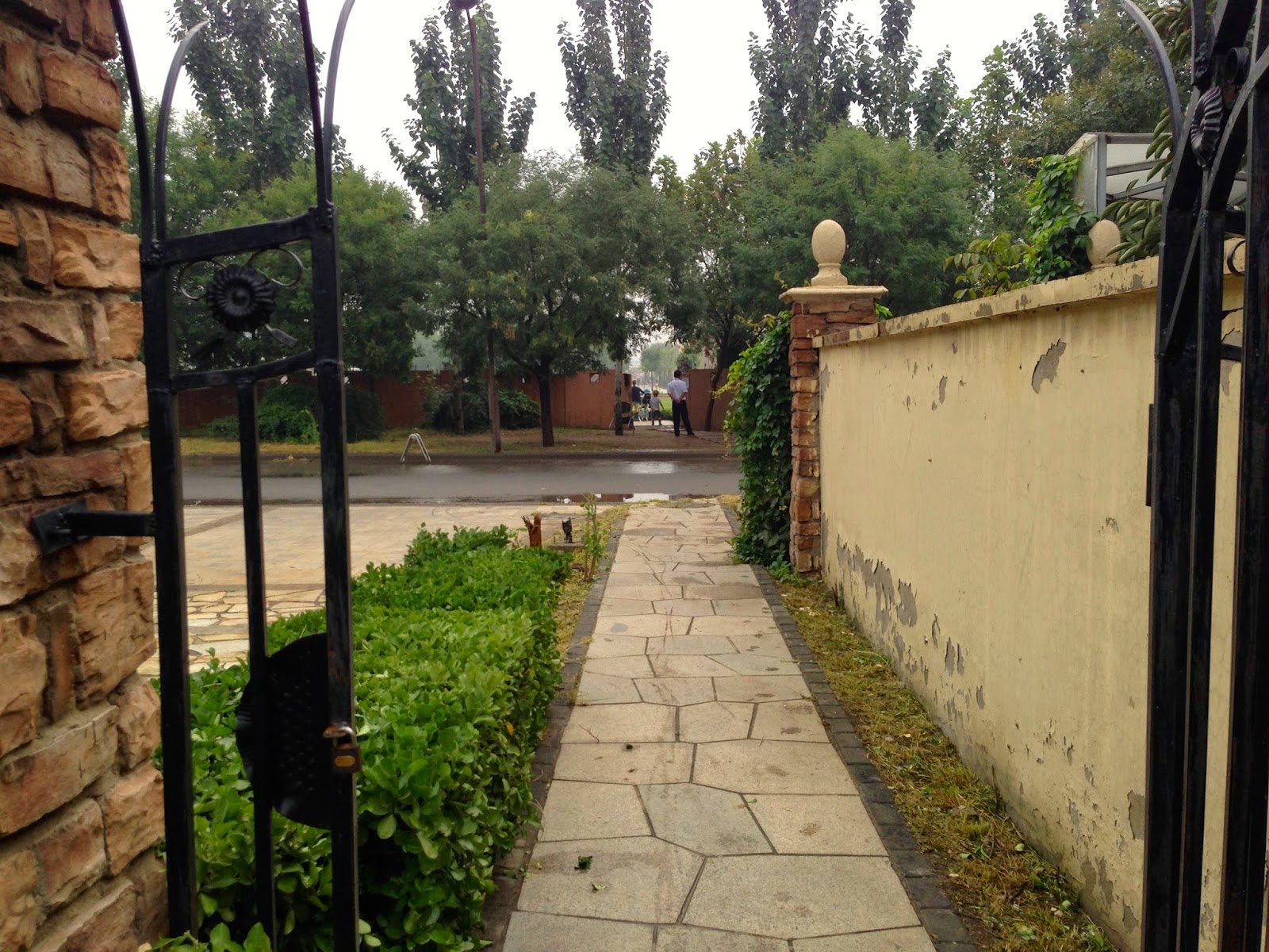 | Her kan I se porten ud af vores område (Original County), og porten ind til skolen. Nu står vagten godt nok med ryggen til, men ellers plejer han at have ret godt fokus på om der kommer børn der skal over vejen. |