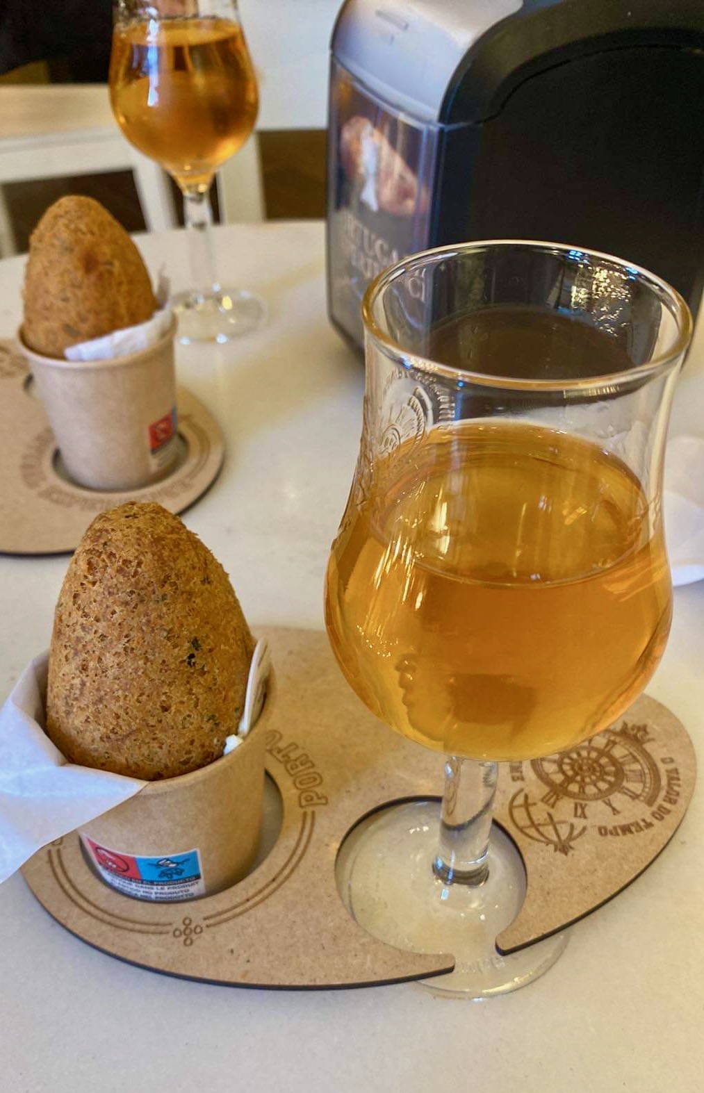 Vi startede med en bolinhos de Bacalhau. Altså saltet torsk, der er lavet til en friturestegt fiskebolle, med eller uden ost inden i. Det bliver serveret flere steder i byen, på sådan nogle lidt turist-fælder. Men vi fik en hver, med portvin – hvor man kan beholde glas efter skænken. Det er et meget fint sted at starte, i midtbyen, ved siden af det højeste tårn i Porto.