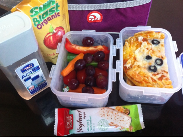 Desuden har de jo nogle ret lange skoledage, jeg afleverer Leonora og Valdemar senest 7.40 – og henter dem igen kl 14.50. I den periode har de to større pauser, First break spiser de snack, second break er lunch. Så her kan I se Leonoras madpakke i dag.
