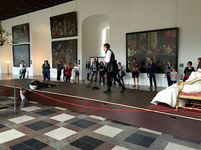 Scener fra Hamlet bliver fremført forskellige steder på Kronborg, man kan følge skuespillerne fra rum til rum, fra scene til scene – indtil duellen her. Det var meget stemningsfyldt at være i kasematterne og se Hamlets fars spøgelse – på Dronningens kammer – i kælderen og se dukketeater. En rigtig god dag.
